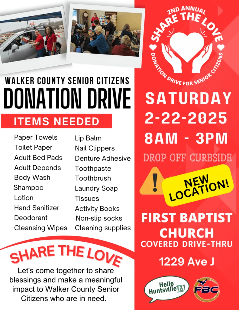 Residents can support the Share the Love donation drive in two ways. On February 22, donors can drive through and drop off their items at FIRST BAPTIST CHURCH, located at 1229 Ave J in Huntsville, Texas, between 8 a.m. and 3 p.m. Volunteers will be stationed curbside to collect donations, making it easy for participants to contribute without leaving their vehicles.