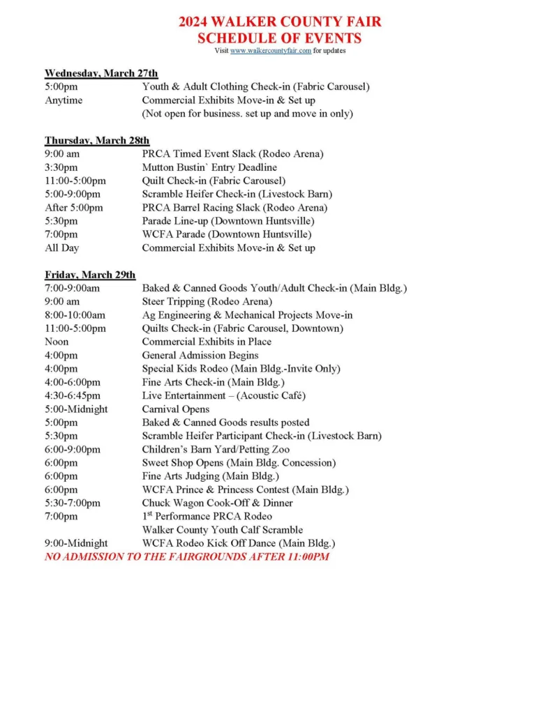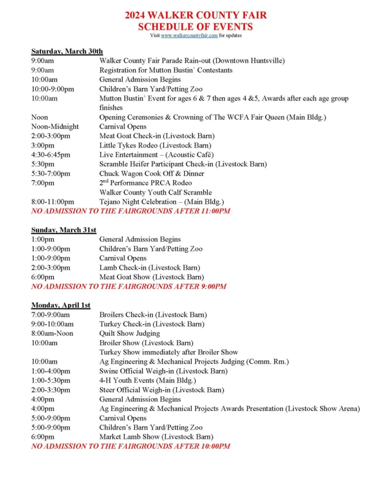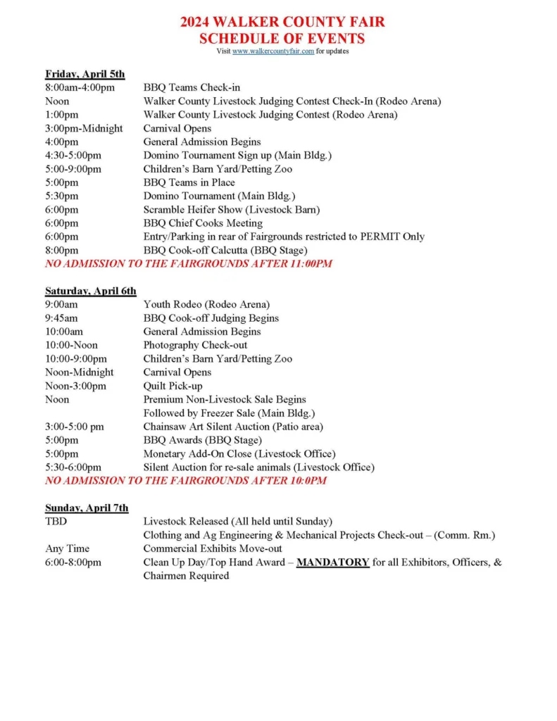 The full schedule of events will guide visitors through the rich array of activities planned for the fair week. For a detailed itinerary and more information on the various events, please visit www.walkercountyfair.com.