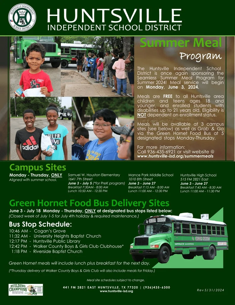 HUNTSVILLE, TX — The Huntsville Independent School District (HISD) has kicked off its Seamless Summer Meal Program for 2024, starting today, Monday, June 3. The program offers free meals to all Huntsville area children and teens aged 18 and younger, as well as enrolled students with disabilities up to 21 years old. Notably, children do not need to be enrolled in HISD to participate.