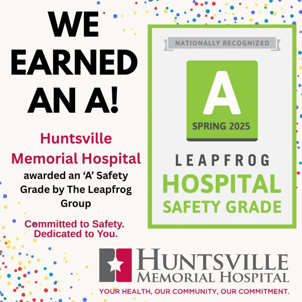 Huntsville, Texas, MAY 1, 2025 – Huntsville Memorial Hospital earned an “A” Hospital Safety Grade from The Leapfrog Group, an independent national nonprofit watchdog focused on patient safety. Leapfrog assigns an “A,” “B,” “C,” “D” or “F” grade to general hospitals across the country based on over 30 measures of errors, accidents, injuries and infections as well as the systems hospitals have in place to prevent them.