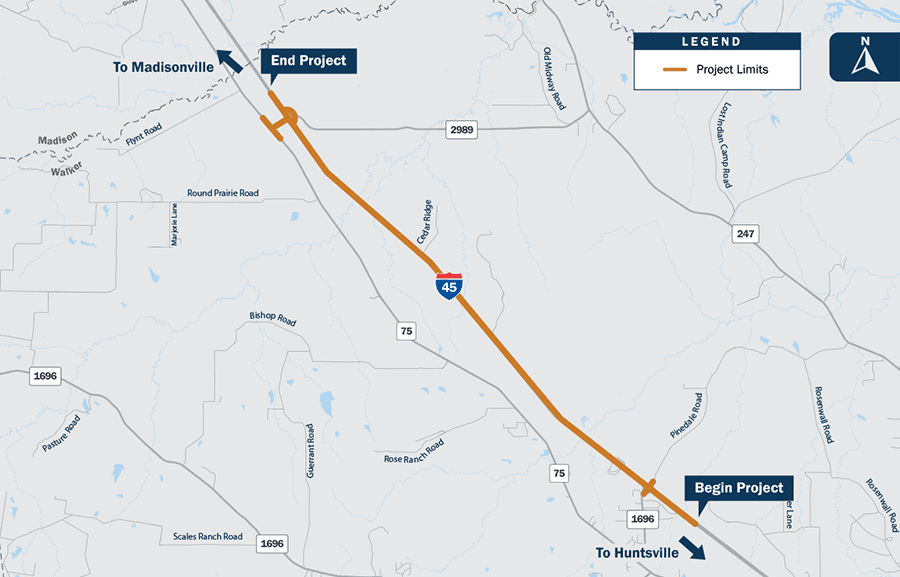 | Purpose | The Texas Department of Transportation – Bryan District is proposing improvements to Interstate 45 (I-45) from 2.1 miles south of FM 1696 to 0.8 miles north of FM 2989 in Walker County, Texas. The purpose of the meeting is to present the proposed project and receive public comment. |