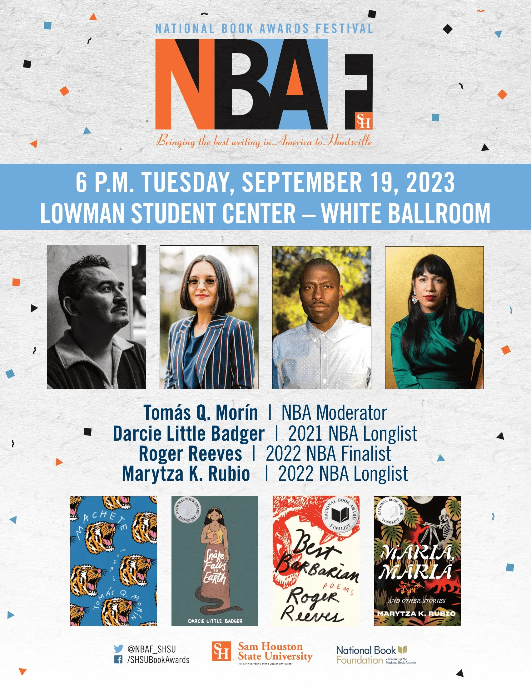 The event is presented in partnership with SHSU's College of Humanities and Social Sciences and the MFA Program in Creative Writing. Following the readings and discussion, there will be a book signing where books will be available for purchase. Further details can be accessed at www.shsu.edu/nba.