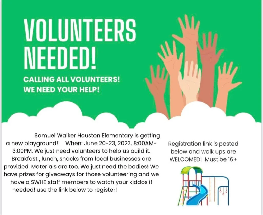 Samuel Walker Houston Elementary School is getting a new playground, and they're calling on community members for help. Between June 20th and 23rd, 2023, the school, in conjunction with the Powell Foundation and KABOOM!, aims to transform their outdoor space into a fun, engaging area for the students to enjoy.
