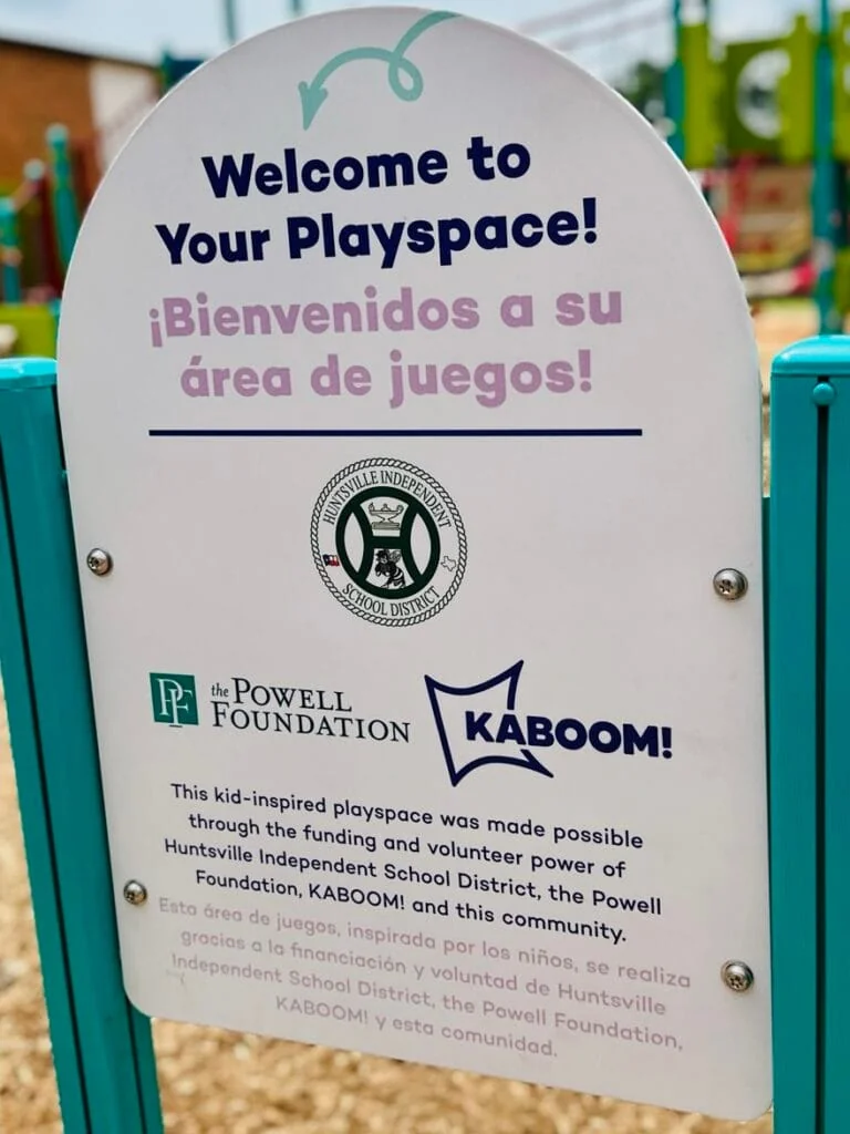 "On behalf of the Huntsville ISD Board of Trustees and District Administration, we welcome you and we thank you for participating in the new playground build. We are so appreciative of the partnership we have with Kaboom! and for the generous support and funding from the Powell Foundation. Without this partnership, our playground build would not be possible. We want to thank everyone who has had a hand in the build from staff members, students, and parents to church and community volunteers! We also want to thank the many businesses and restaurants for the food and snack donations throughout the week. Your hard work and community spirit have made this new playspace happen for our kids. We know this playground will bring lots of joy and a safe place to play for our children for many years to come."