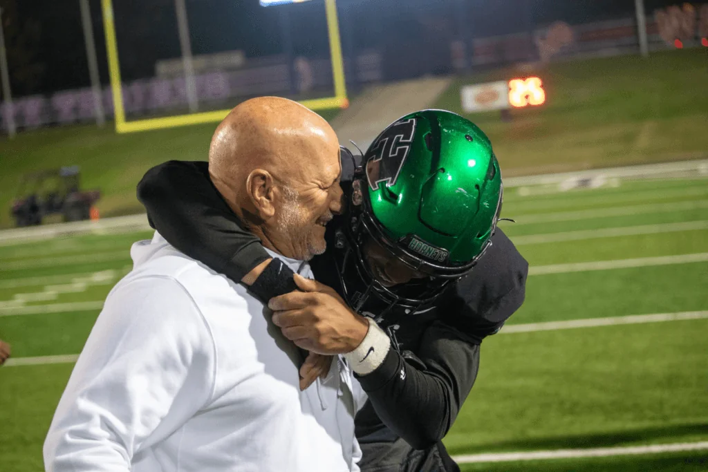 A Huntsville Hornet football player shares a heartfelt embrace with Head Coach Rodney Southern in a moment of camaraderie and support. (Undated photo, Courtesy of FCA Piney Woods West Facebook)