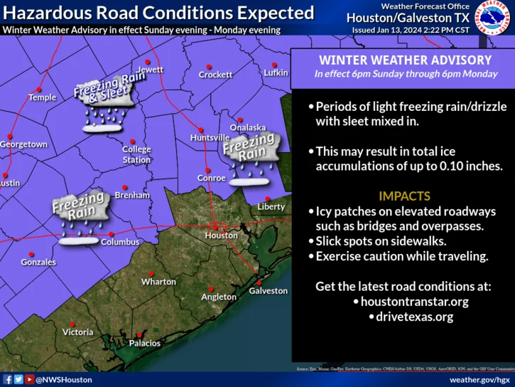 URGENT - WINTER WEATHER MESSAGE National Weather Service Houston/Galveston TX 213 PM CST Sat Jan 13 2024 TXZ163-164-176>179-195>200-210>212-140600- /O.NEW.KHGX.WW.Y.0001.240115T0000Z-240116T0000Z/ Houston-Trinity-Madison-Walker-San Jacinto-Polk-Burleson-Brazos- Washington-Grimes-Montgomery-Northern Liberty-Colorado-Austin- Waller- Including the cities of Crockett, Trinity, Groveton, Madisonville, Huntsville, Shepherd, Coldspring, Livingston, Corrigan, Caldwell, Somerville, College Station, Bryan, Brenham, Navasota, Conroe, The Woodlands, Liberty, Cleveland, Dayton, Columbus, Eagle Lake, Weimar, Sealy, Bellville, Hempstead, Prairie View, Brookshire, and Waller 213 PM CST Sat Jan 13 2024 ...WINTER WEATHER ADVISORY IN EFFECT FROM 6 PM SUNDAY TO 6 PM CST MONDAY... * WHAT...Freezing rain expected. Total ice accumulations of up to one tenth of an inch may result in icy patches on elevated roadways such as bridges and overpasses. * WHERE...Portions of southeast Texas. * WHEN...From 6 PM Sunday to 6 PM CST Monday. * IMPACTS...Difficult travel conditions are possible. The hazardous conditions could impact the morning or evening commute. * ADDITIONAL DETAILS...Sleet/ice pellets may mix into the freezing rain at times. The higher ice accumulations are expected generally north of SH-105 and east of I-45. PRECAUTIONARY/PREPAREDNESS ACTIONS... Slow down and use caution while traveling. Prepare for possible power outages. The latest road conditions for the state you are calling from can be obtained by calling 5 1 1.