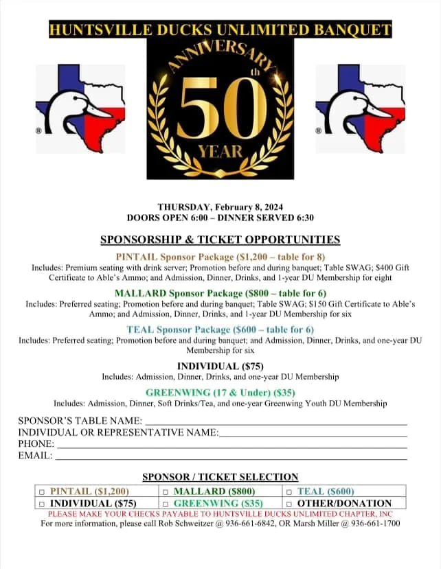 HUNTSVILLE, TX — The Huntsville chapter of Ducks Unlimited is gearing up for its much-anticipated annual banquet on Thursday, February 8, 2024. The event, known for its commitment to wetlands and waterfowl conservation, promises an evening filled with fine dining, exclusive sponsorships, and community engagement.