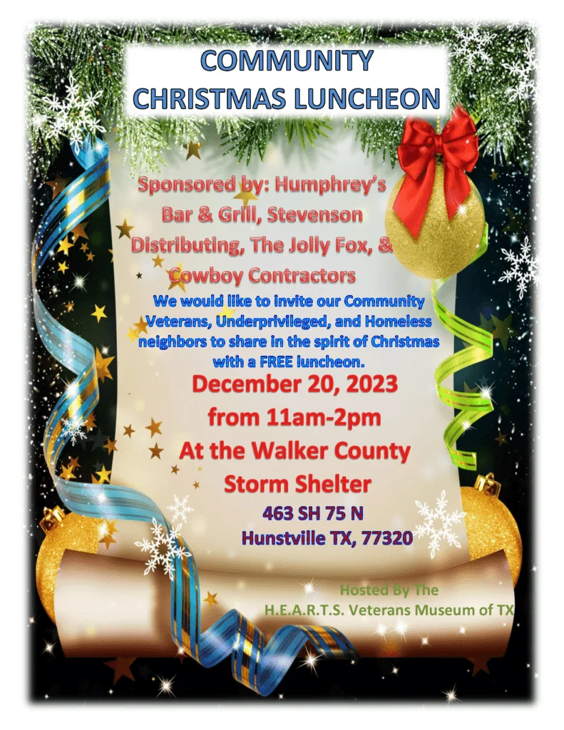 HUNTSVILLE, TX - The spirit of Christmas giving is alive and well in Huntsville, Texas, where local businesses and community leaders are coming together to host a special Christmas lunch for the less fortunate and veteran population. The event, scheduled for December 20th at the Walker County Storm Shelter and hosted by The H.E.A.R.T.S. Veterans Museum of Texas, is a collaborative effort to provide warmth and care during the festive season.