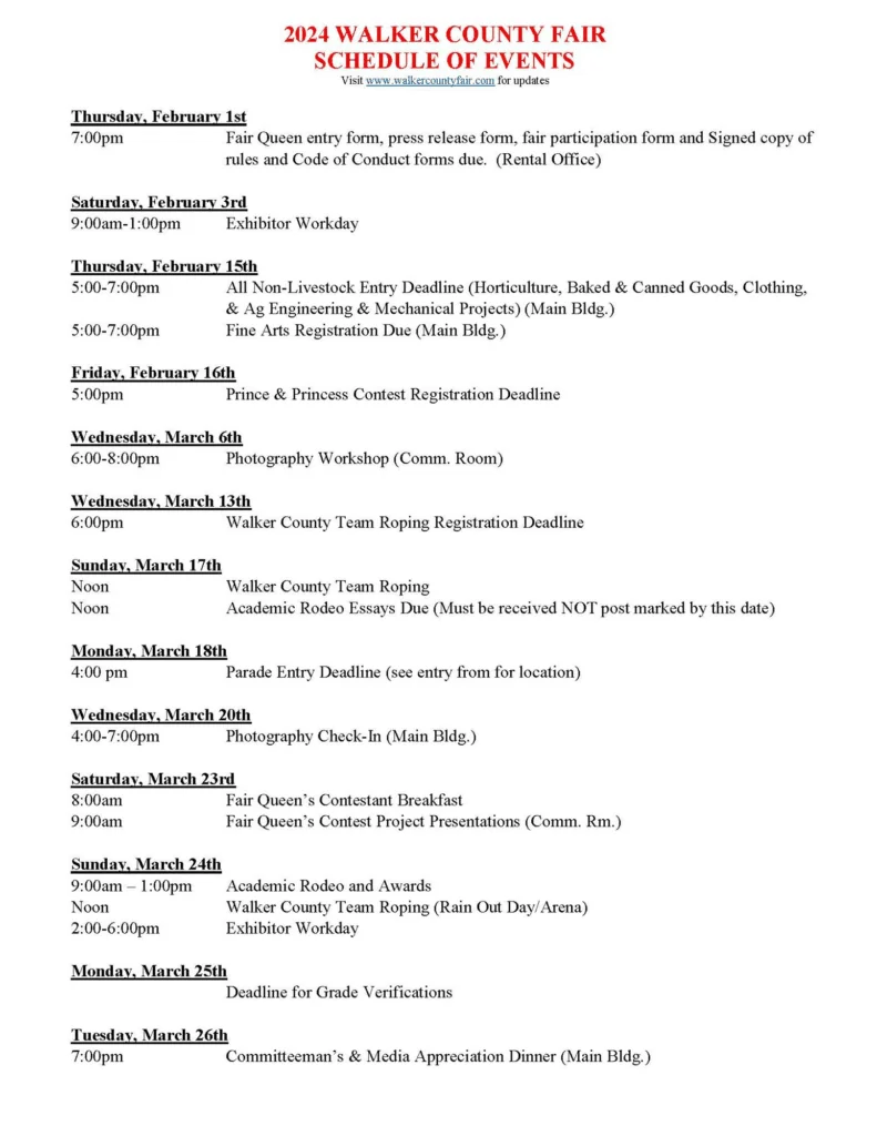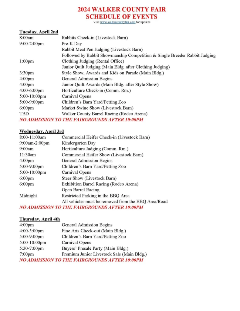 The full schedule of events will guide visitors through the rich array of activities planned for the fair week. For a detailed itinerary and more information on the various events, please visit www.walkercountyfair.com.