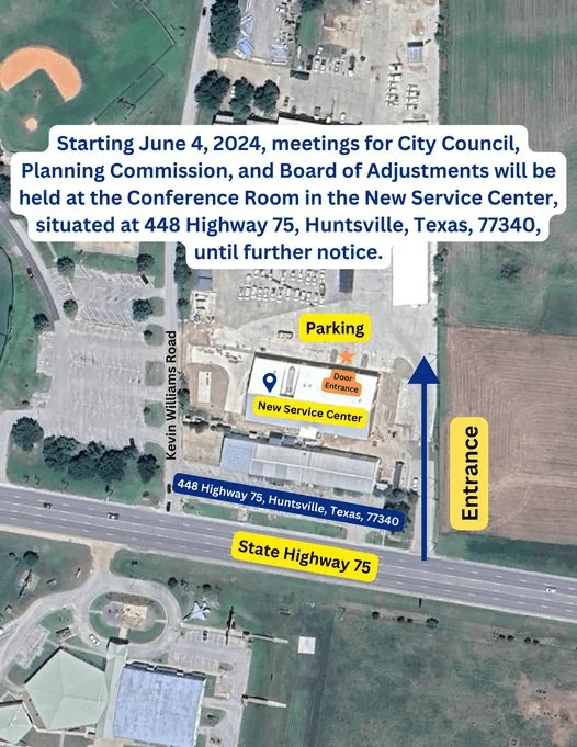 HUNTSVILLE, Texas — The City of Huntsville has announced that starting June 4, 2024, all meetings for the City Council, Planning Commission, and Board of Adjustments will be relocated to the Conference Room in the New Service Center at 448 Highway 75. This move is temporary, lasting until the completion of the new City Hall.