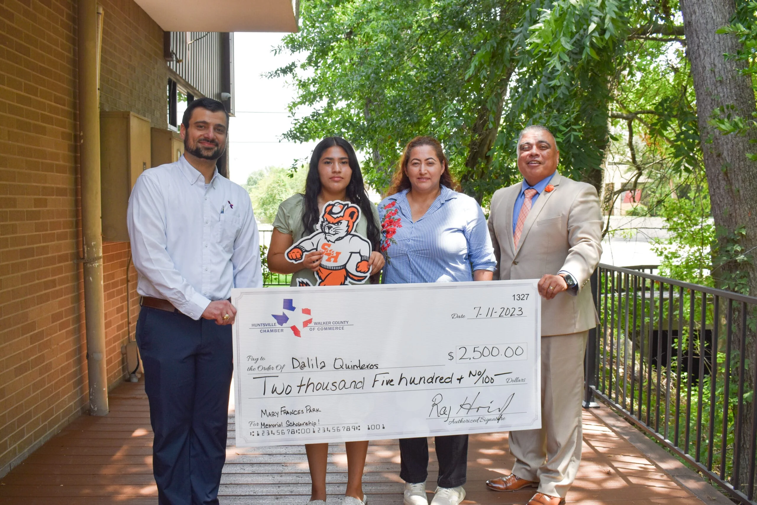 This past week, the Huntsville Walker County Chamber of Commerce recognized the recipients of the Mary Frances Park Memorial Scholarship. This highly competitive scholarship was awarded to four accomplished Huntsville High School seniors: Melissa Garrido, Elijah McMichael, Dalila Quinteros, and Daniel Ascencio.
