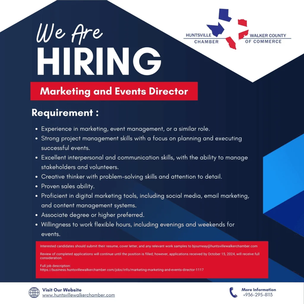 The Huntsville Walker County Chamber of Commerce is seeking a Marketing and Events Director. Below are the specific requirements for the position: