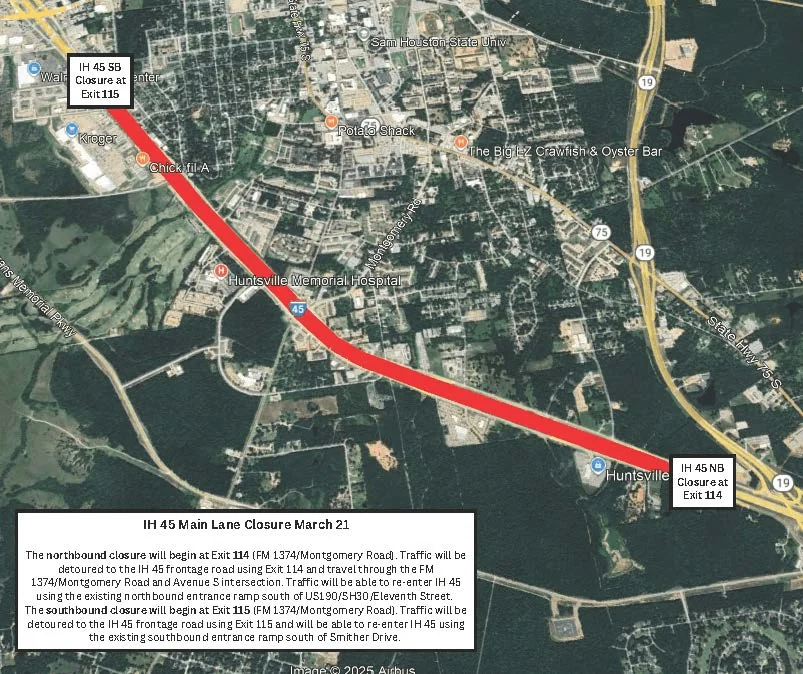 HUNTSVILLE – Beginning at 10 p.m. on Friday, March 21, 2025, there will be a full closure of both north and southbound main lanes on IH 45 to demolish the existing Smither Drive bridge. The closure is anticipated to last through the weekend and will be re-opened by 7 a.m. on Monday, March 24, 2025.