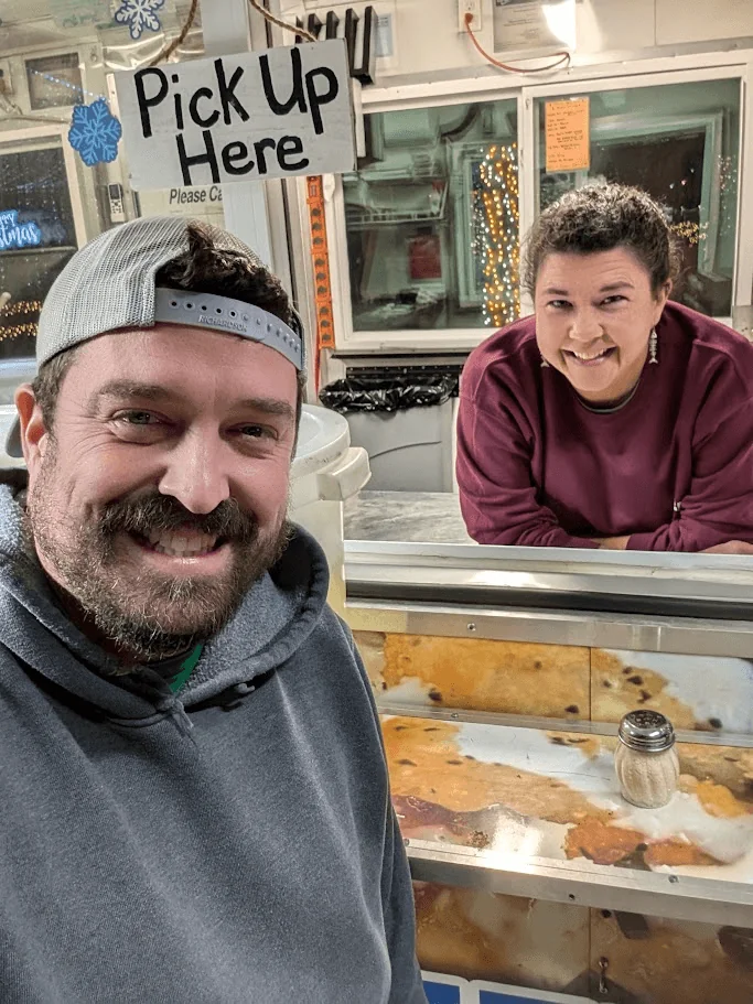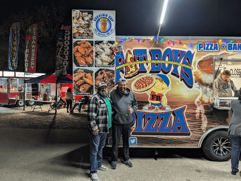 As the night continued, we enjoyed some delicious treats. Making s’mores around the fire pit was a cozy and fun experience. We also grabbed dinner from the food vendors, trying options like Fat Boy’s Pizza and Frank’s Tacos. Both were fantastic! Live Christmas music played throughout the park, adding to the festive ambiance. Local musicians and performers on the community stage kept the energy lively and joyful.