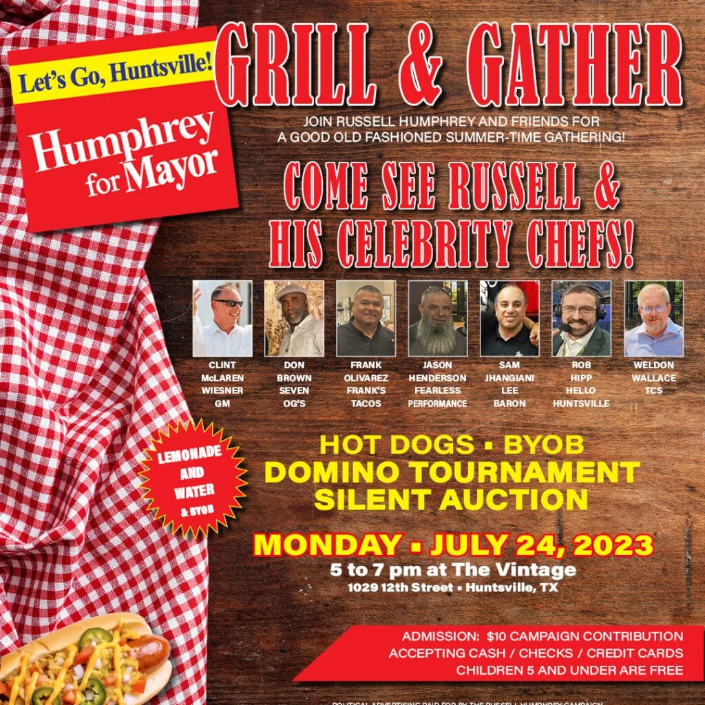 HUNTSVILLE, Texas - Russell Humphrey, a mayoral candidate of Huntsville, is hosting an event, Grill & Gather, to support his campaign on Monday, July 24 at The Vintage, a new venue at 1029 12th Street.