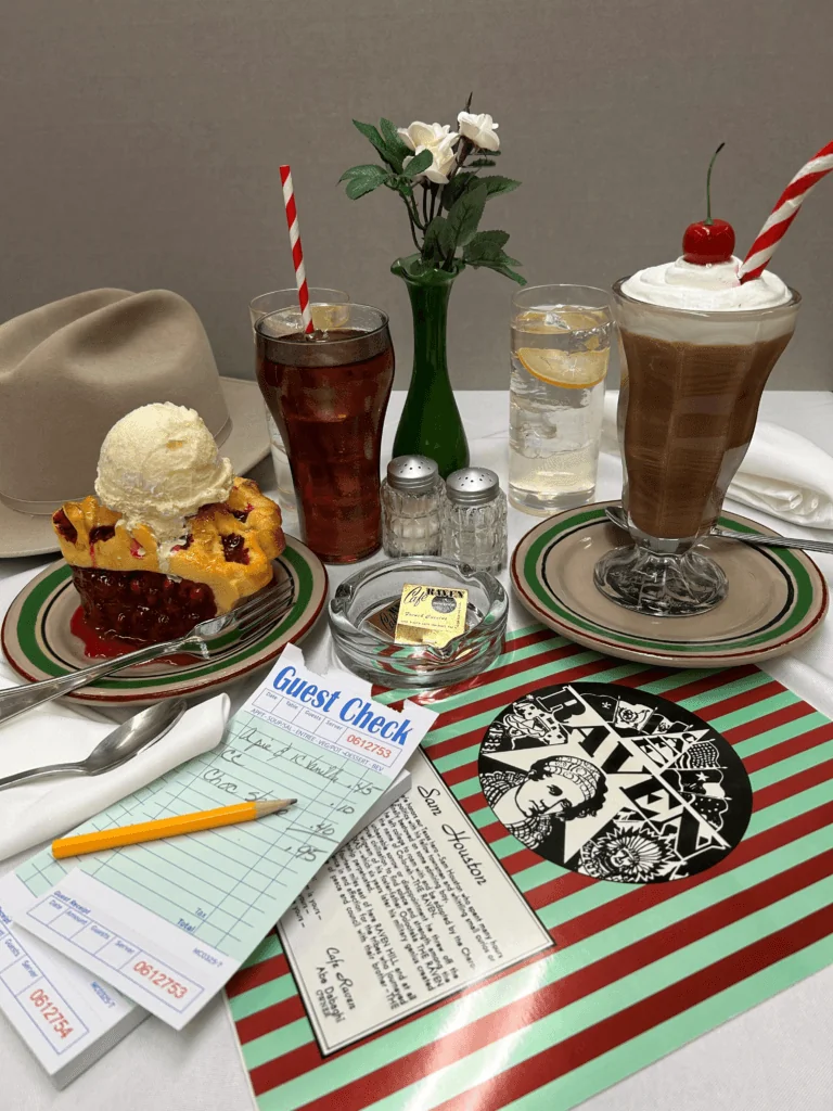 Over the next few months, Bill shared some of his family’s history with Birdsall. “After my conversations with Bill and his brother Shad, the museum decided to host a temporary exhibit featuring the Café Raven, as both a local hotspot for decades and with the connection between Abe and his affection for Sam Houston—who is featured prominently not only in the very name of the café, but throughout the iconography of the café itself.”