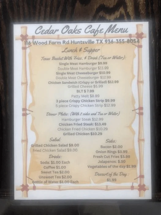 Cedar Oaks Cafe, nestled within Cedar Oaks RV Park in Huntsville, Texas, has been delighting customers with good country food since opening its doors a couple of months ago. Owned by Lee Killingsworth and his wife, the cafe offers a friendly and inviting atmosphere for both campground guests and the general public.
