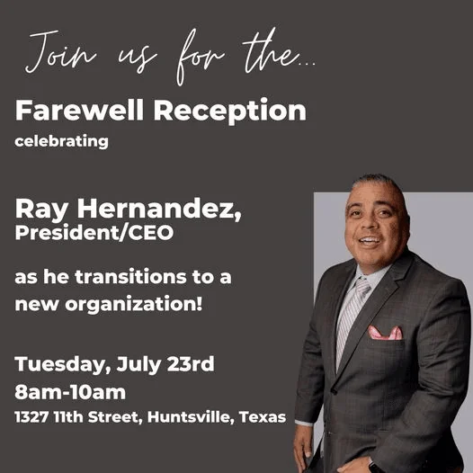 The Huntsville Walker County Chamber of Commerce will host a farewell reception to honor Ray Hernandez's transition to Partnership Lake Houston. The event is scheduled for Tuesday, July 23rd, from 8am-10am at 1327 11th Street, Huntsville, Texas. It will be a "come and go" farewell party with light breakfast and coffee. Ray has served as the Chamber President/CEO for the past five years, and the community is invited to join board members, staff, and peers to celebrate his accomplishments and wish him well in his new role.