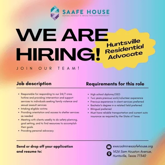 HUNTSVILLE, Texas — SAAFE House is seeking dedicated individuals to join their team as part-time Residential Advocates at the Huntsville shelter. This role is critical in supporting individuals affected by family violence and sexual assault, providing a meaningful opportunity to make a difference in the community.