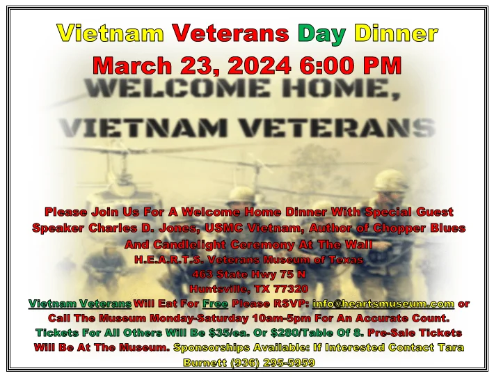 The H.E.A.R.T.S. Veterans Museum of Texas is gearing up to host a special Welcome Home Dinner on Vietnam Veterans Day, featuring distinguished guest speaker Charles D. Jones, USMC Vietnam, and author of "Chopper Blues." The event will also include a solemn Candlelight Ceremony at The Wall.